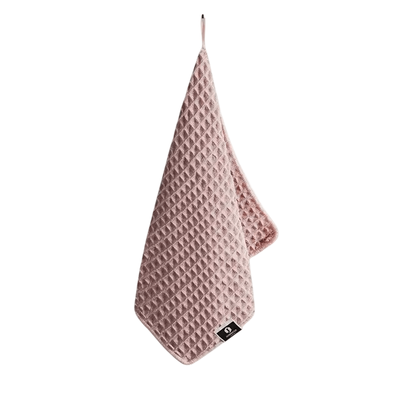 Microfiber cleaning cloths with waffle weave pattern, ideal for kitchen, coffee bar, or delicate surfaces. Each pack includes four cloths in blue, white, pink, and brown. Lightweight and highly absorbent, with a hanging loop for easy placement on tools or aprons.